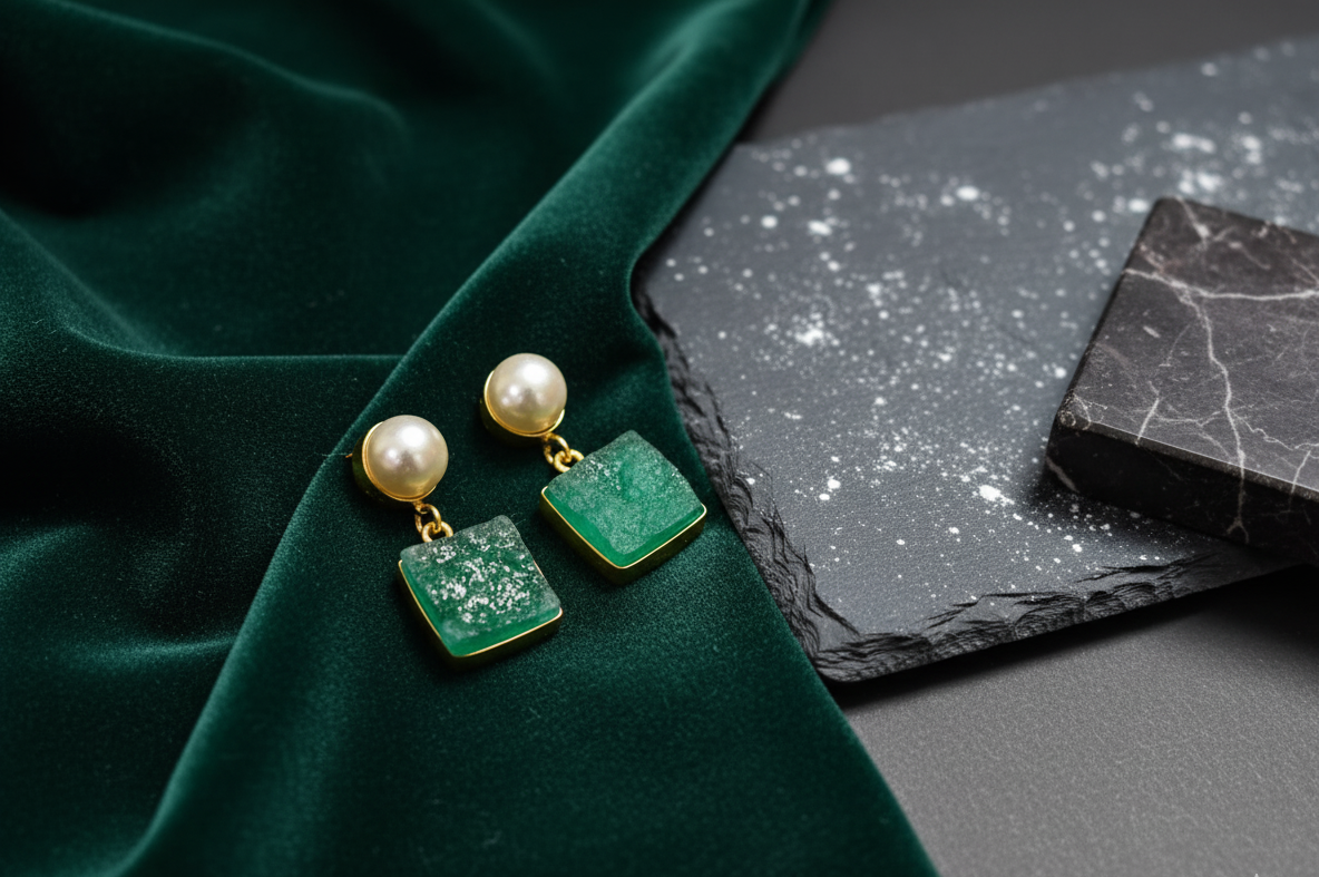 These elegant drop earrings combine raw green druzy stones with classic pearl accents for a look that’s both earthy and refined. The deep emerald hue of the druzy contrasts beautifully with the lustrous pearl, all set in warm gold-tone metal. With their subtle sparkle and natural texture, they make a versatile statement for both everyday and special occasions.