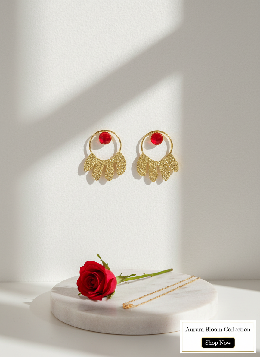 Bold, beautiful, and utterly unique. These eye-catching sunburst drop earrings feature a hammered gold-tone texture that catches the light beautifully. Topped with a vibrant, fiery red cabochon stone, they bring a pop of color and artistic flair to any outfit. Part of the Aurum Bloom Collection.